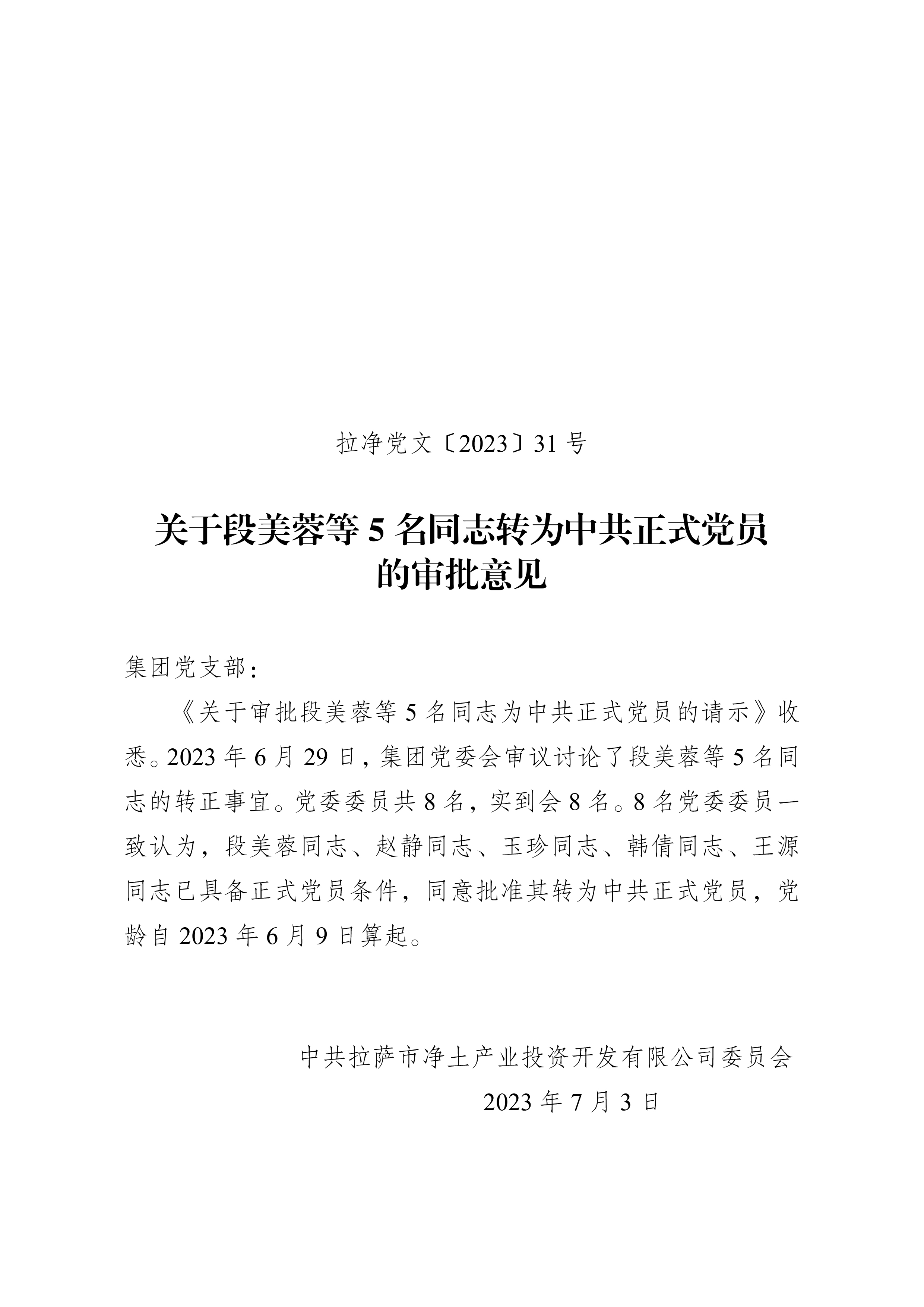 關(guān)于段美蓉等5名同志轉(zhuǎn)為中共正式黨員的審批意見