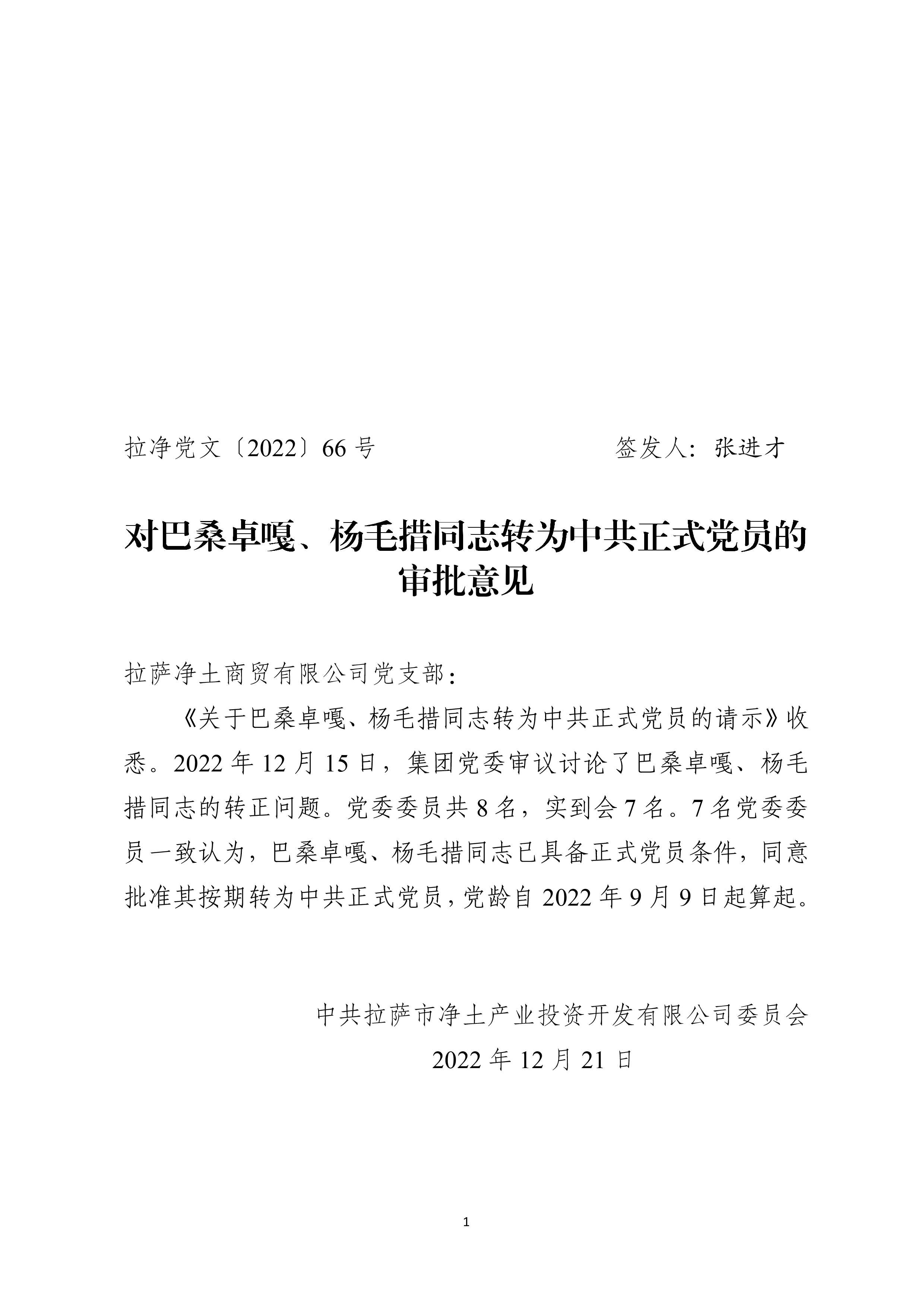 對巴桑卓嘎、楊毛措同志轉(zhuǎn)為正式黨員的審批意見