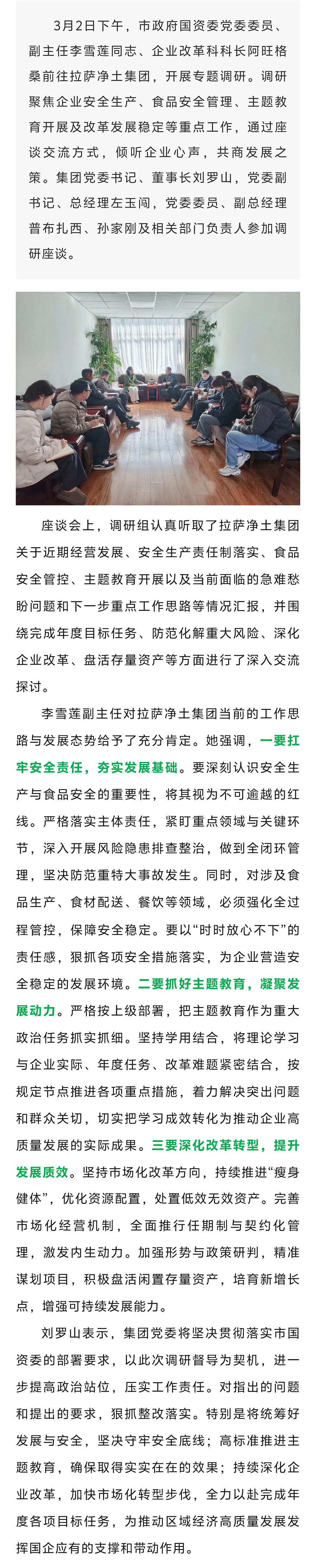 市政府國(guó)資委副主任李雪蓮一行赴拉薩凈土集團(tuán)開(kāi)展“四下基層”專(zhuān)題調(diào)研