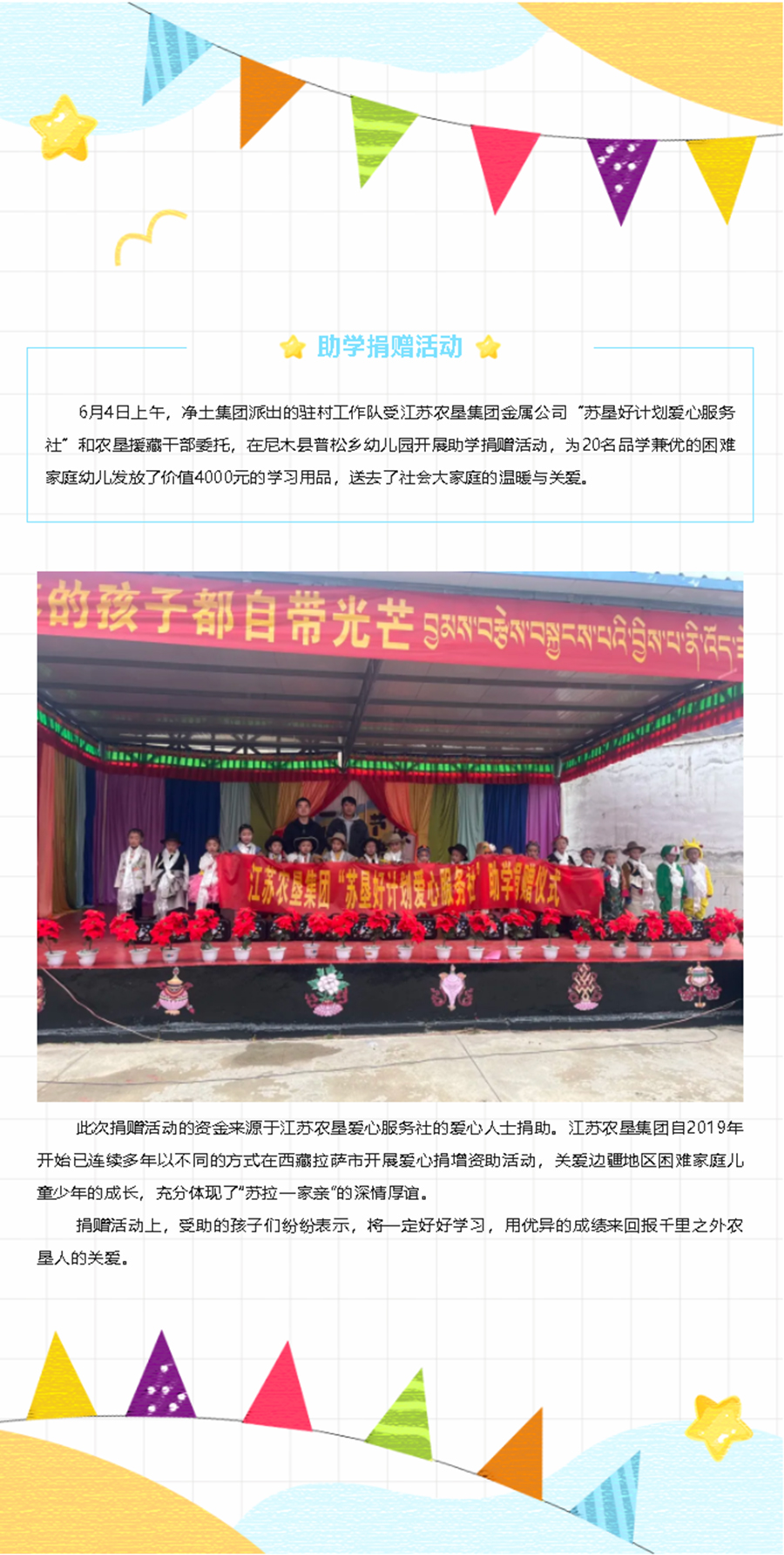 市凈土集團(tuán)受援單位江蘇農(nóng)墾集團(tuán)“蘇墾好計(jì)劃愛(ài)心服務(wù)社”在普松鄉(xiāng)幼兒園開(kāi)展助學(xué)捐贈(zèng)活動(dòng)