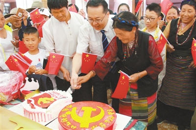 在建黨98周年之際,拉薩火車站舉行與旅客同心同行慶祝黨的生日快閃活動(dòng)。 圖為拉薩火車站黨員與旅客一同切蛋糕,共慶黨的生日。